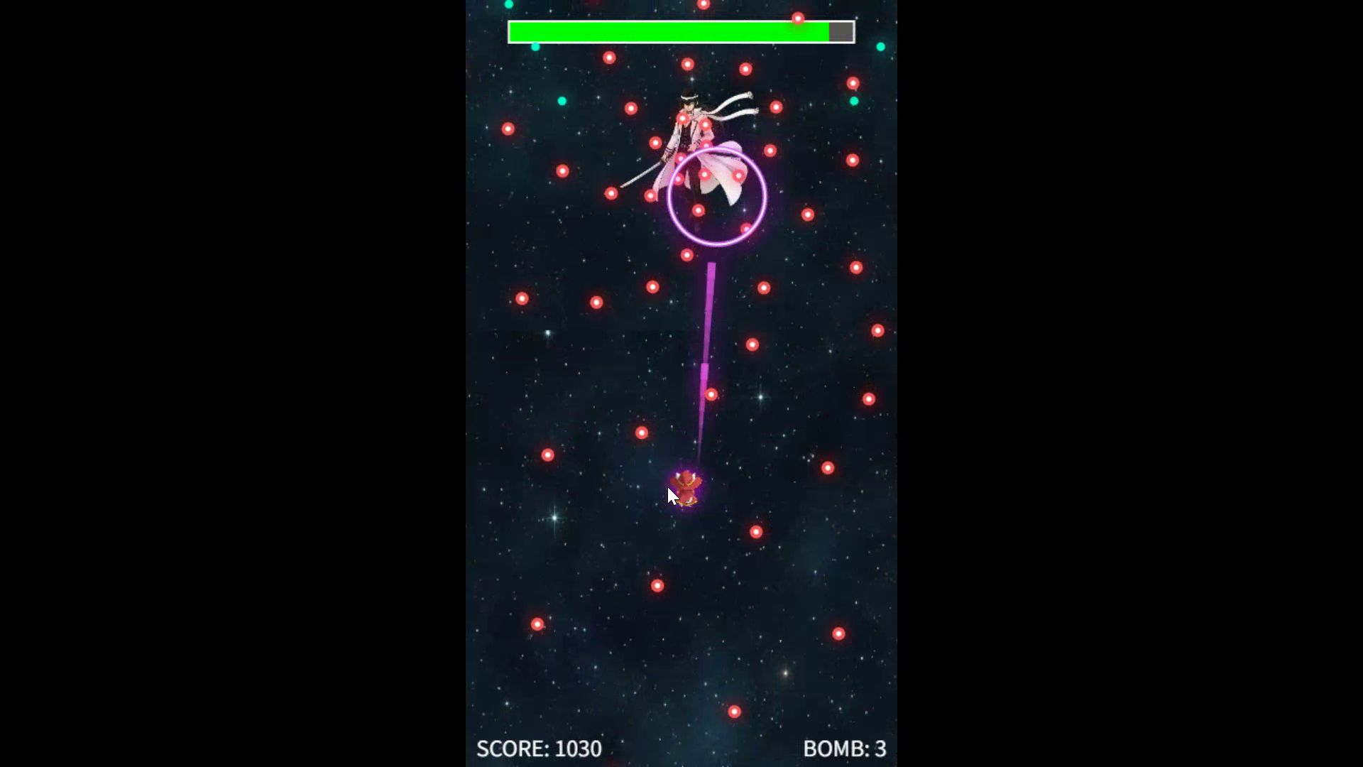 「キャラクターと玉が紫色に光っているエフェクトを入れてほしい。ボスのHPを半分にして、HPが減ったら攻撃パターンが変わるようにしてほしい。ボスが少しゆっくり細かく動くようにしてほしい。またボスの玉で大き目の打つと壊れる玉をくわえてほしい。」