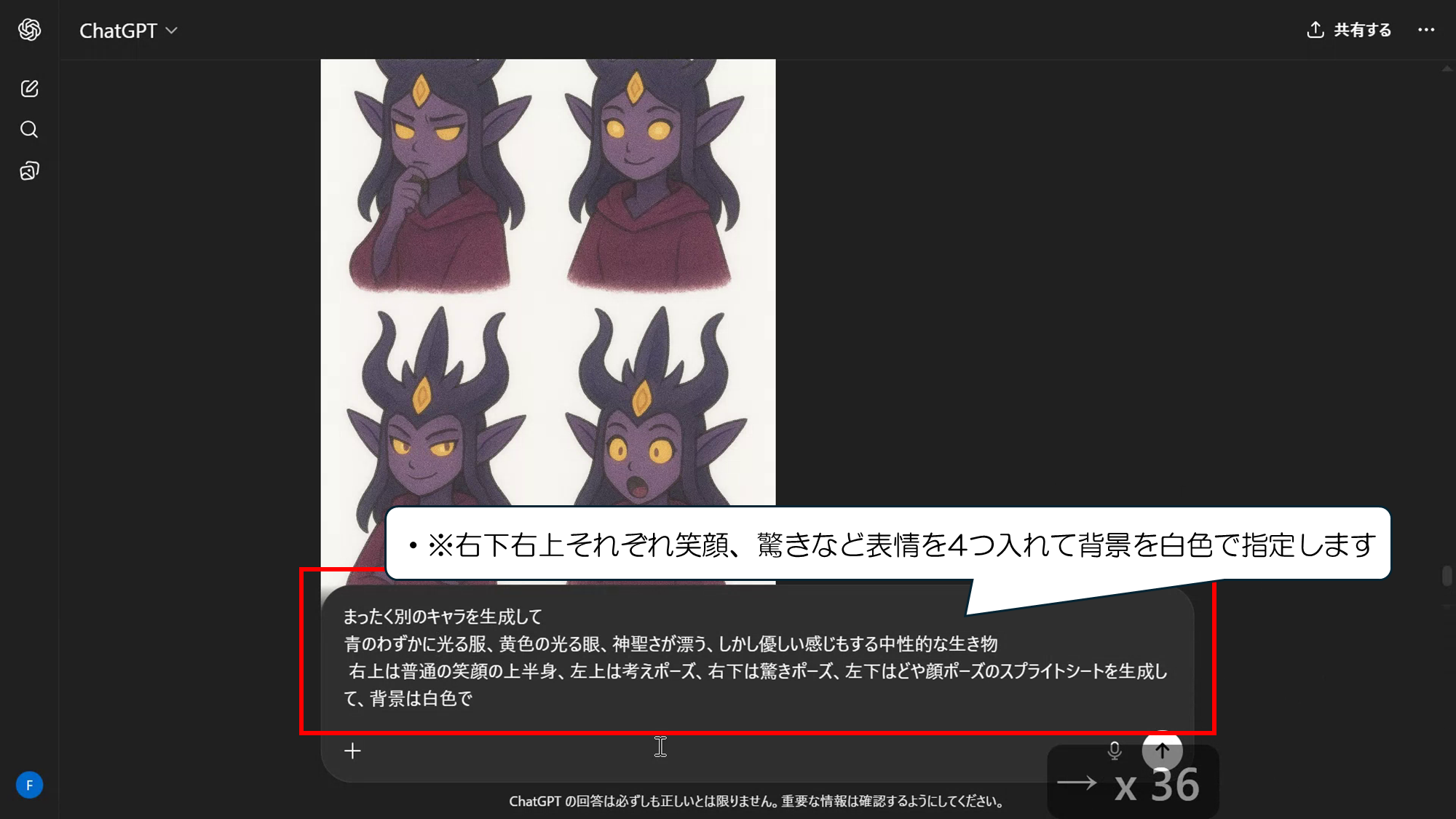 ・ChatGPTのサイトで4パータンの絵をつくるように入力して生成します