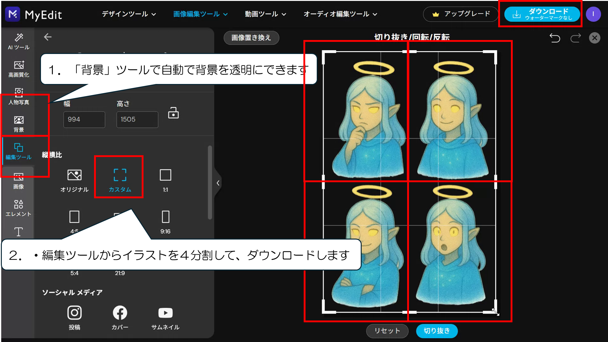2.大きさを調整、切り抜き、ダウンロードを4人分おこないます