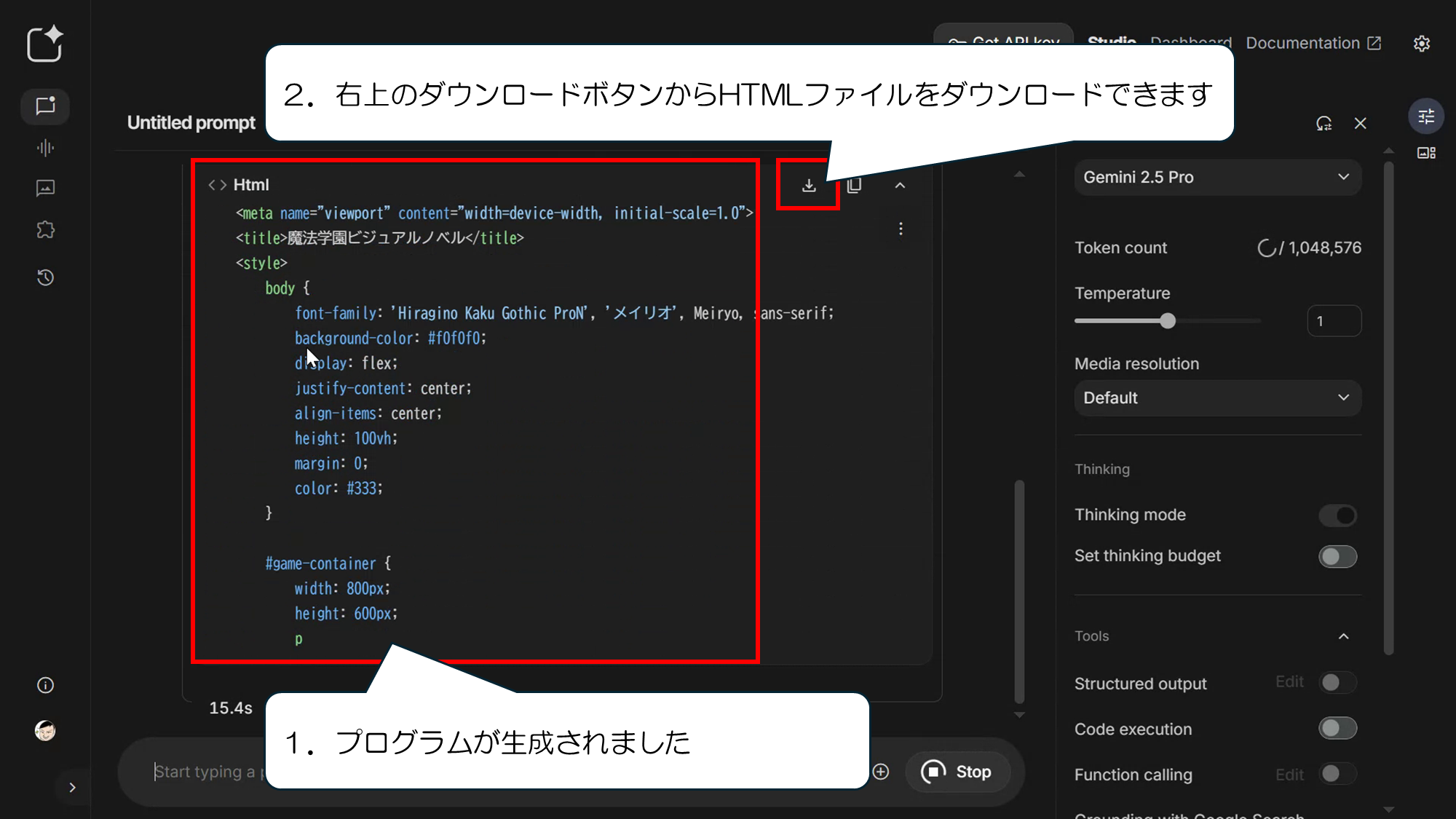 2.右上のダウンロードボタンからHTMLファイルをダウンロードできます