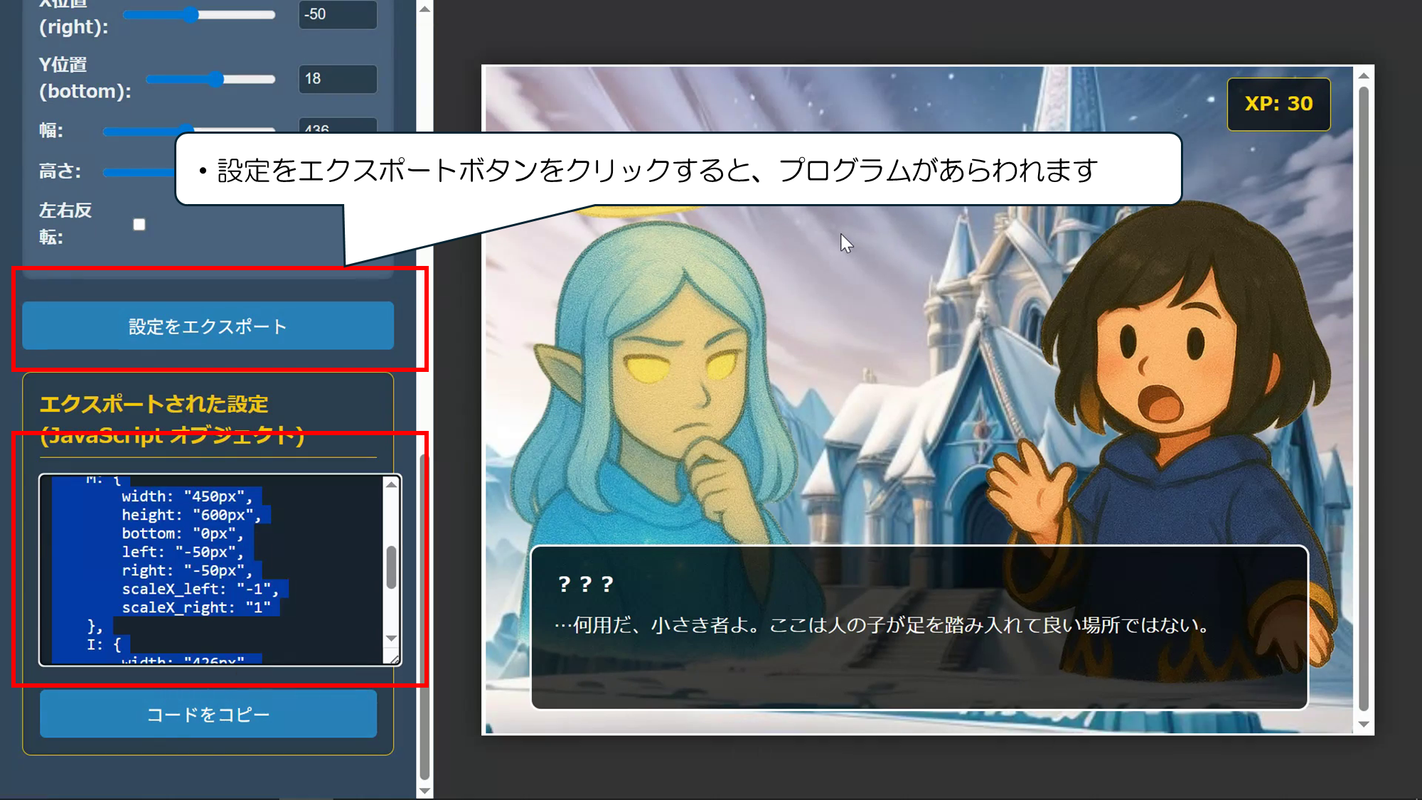 ※ このツールでキャラの位置を変えると座標のプログラムを表示します