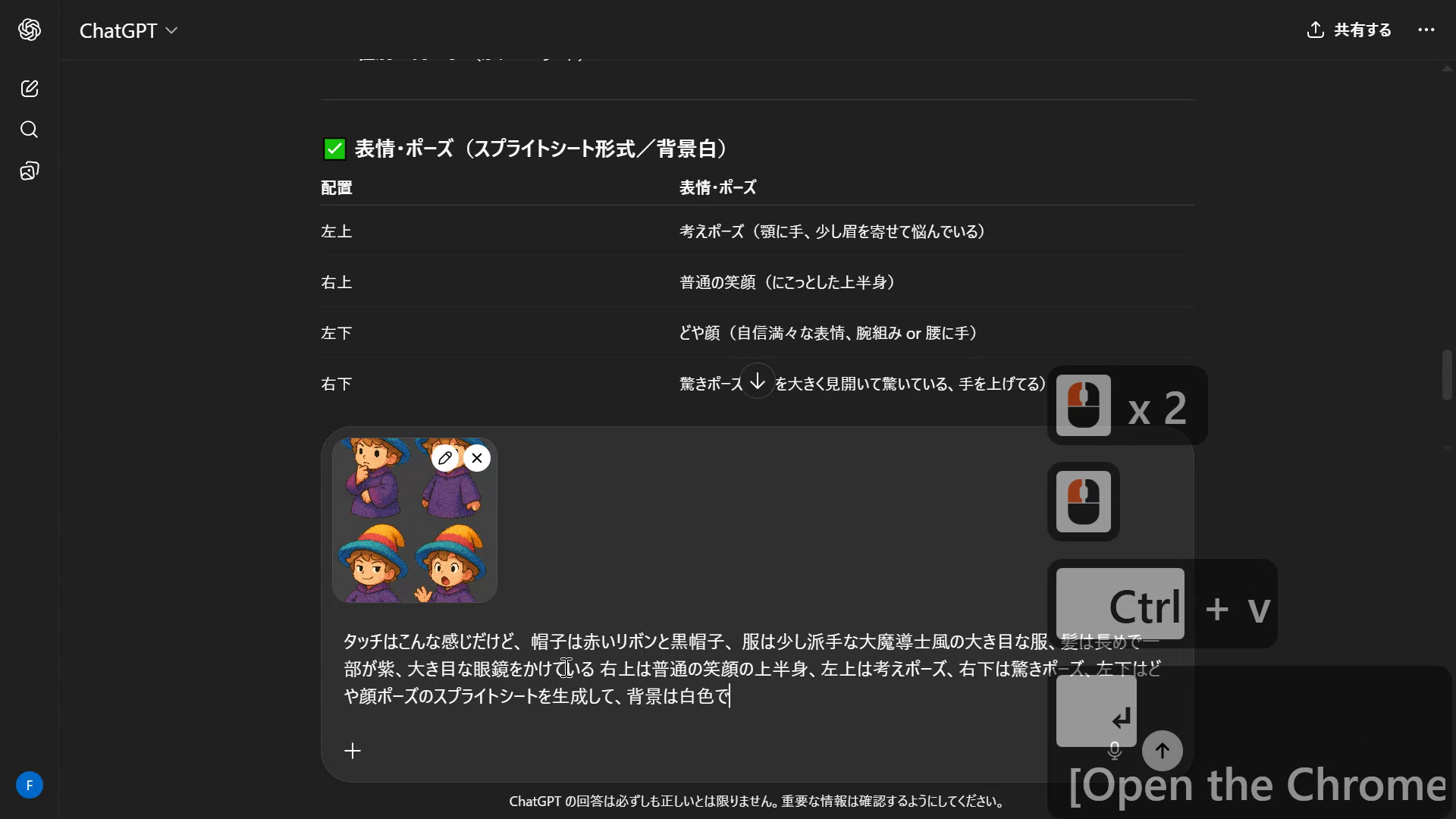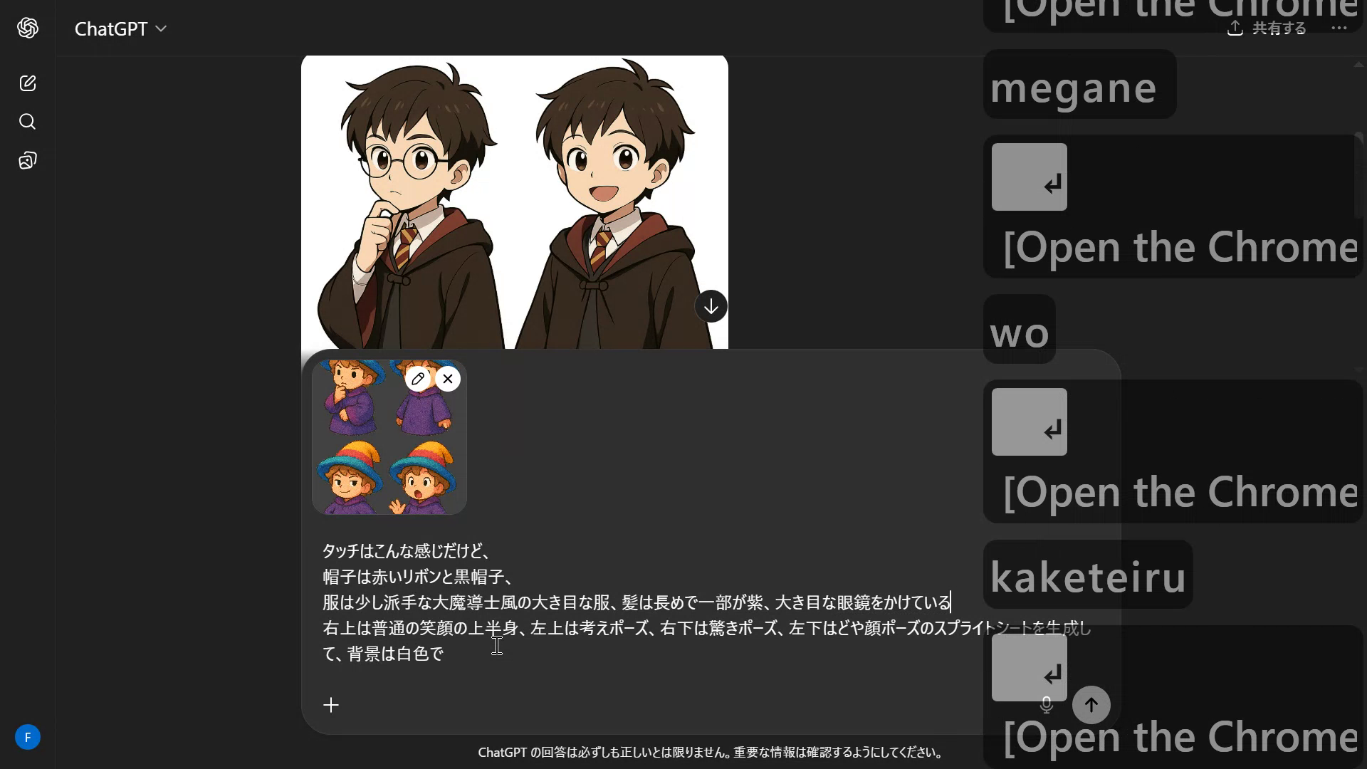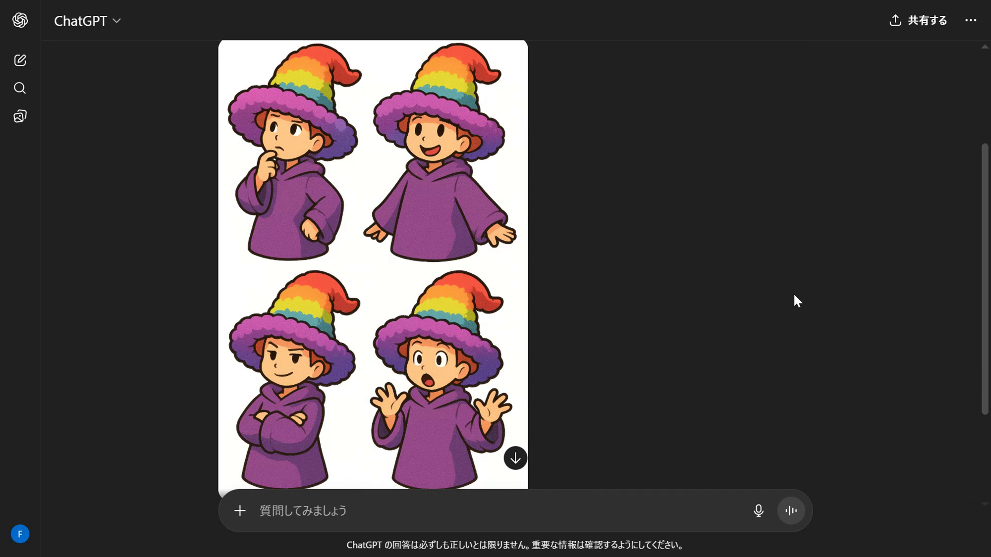 ChatGPTのサイトで4パータンの絵をつくるように入力して生成します