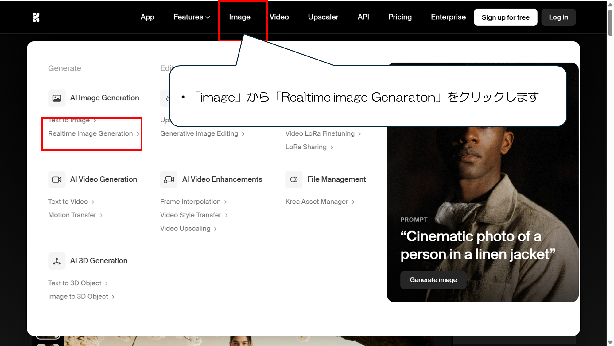 ・トップ画面「image」から「Realtime image Genaraton」をクリックします
