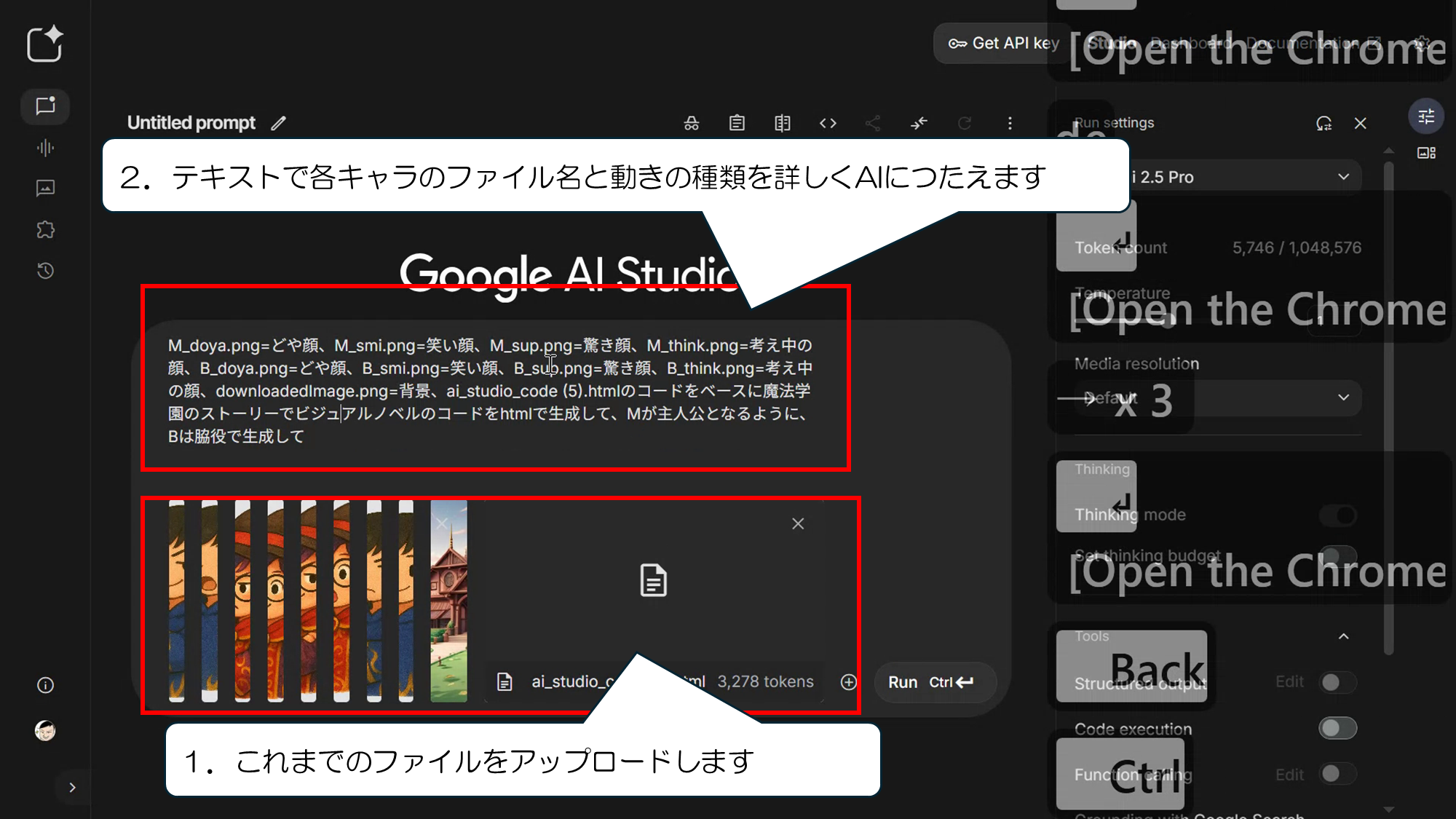 1.Google AI Studioに移動して、キャラ、背景画像をアップロードします